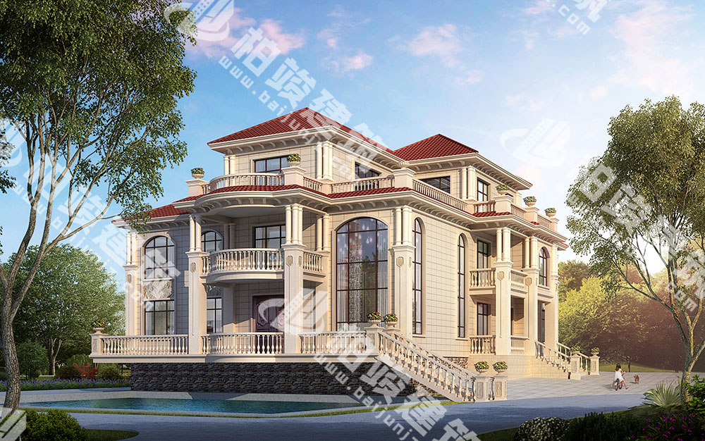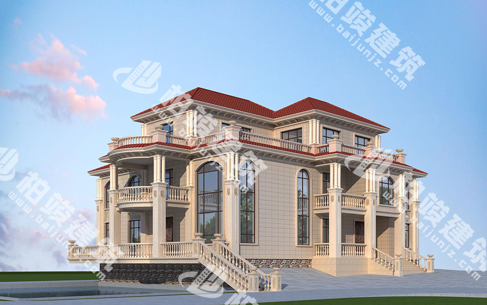 外墻裝飾:多層花瓶型護(hù)欄,搭配簡(jiǎn)約羅馬柱、歐式花盆、浮雕,繁簡(jiǎn)相間,視覺效果豐富不雜糅