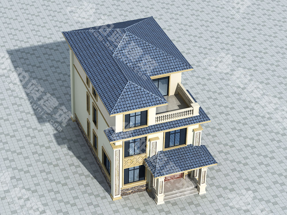 屋頂造型:灰藍(lán)色釉面瓷瓦裝飾坡形屋頂,光澤熠熠,清新時(shí)尚